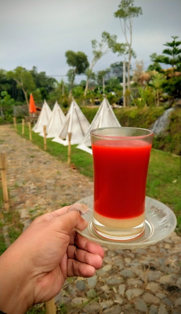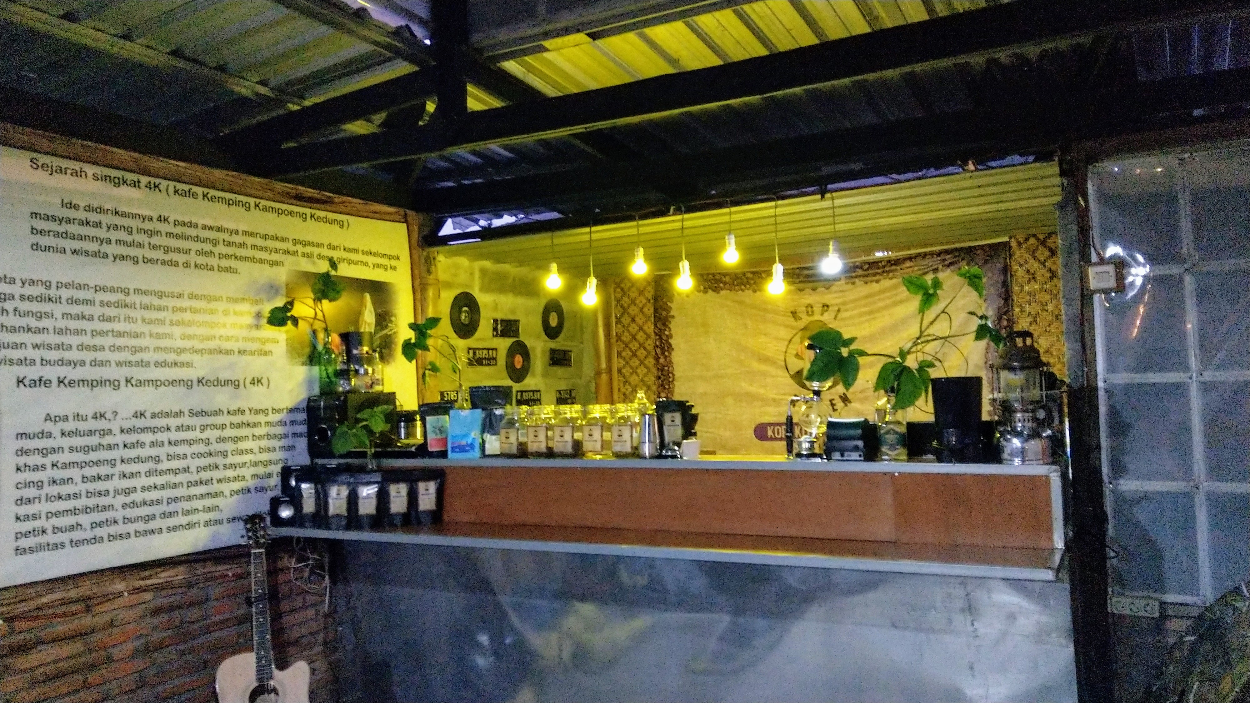 Ngopi sejuk di Kafe Kemping Kampoeng Kedung (K4). Lokasi di Giripurno Bumiaji, titik lokasi bisa dicari di Google Maps. Penisirin gara-gara Mas Owner tadi pagi posting minuman Secang Susu