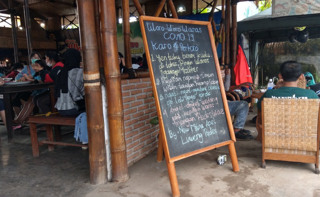 Di bagian kiri ada ruang dan meja kasir, di bagian kanan belakang sepanjang area adalah meja-meja berisi masakan-masakan yang pengunjung dapat mengambil sendiri. Pengunjung berbaris antri mulai dari mengambil piring, nasi dan menu lainnya.