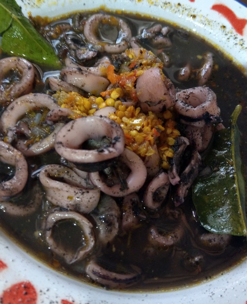 Menu masakan pedas yaitu lauk dengan kuah santan pedas berikut berbagai isian seperti bebek, ayam, mentok, ikan kakap, cumi, ikan pe, ikan tongkol, kepala kakap, ikan laut, udang, kikil dan kerang dengan harga berkisar Rp15,000 sampai dengan Rp25,000.