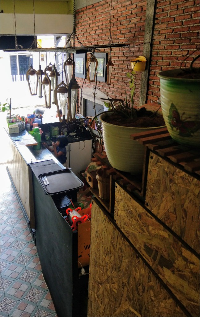 Lantai paling bawah sepertinya hanya untuk meja pelayanan, dapur dan kasir. Ada tempat duduk kecil di depan sepertinya hanya untuk driver ojol yang nunggu pesanan online.