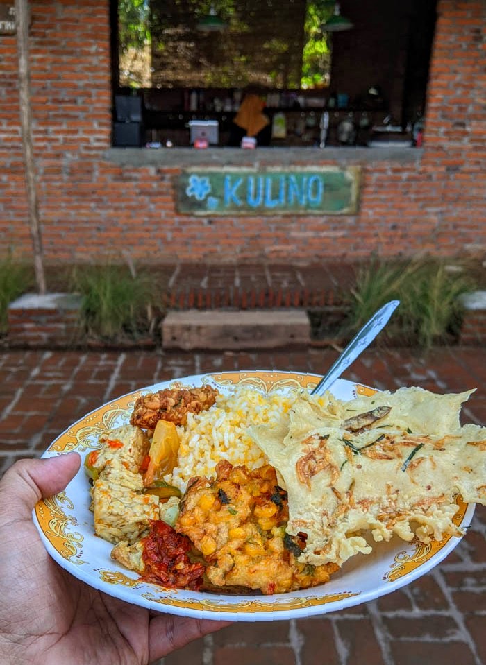Ketiga, catatan dari saya buat Anda yang belum pernah ke sini, mungkin sebisa mungkin meluncur pakai motor saja. Lokasi Kulino benar-benar di tengah kampung. Anda akan sedikit kesulitan mencari tempat parkir jika ke sini bermobil. Dapat parkirpun Anda masih harus berjalan kaki sekian ratus langkah. Kalau naik motor Anda bisa langsung parkir di depan pintu gerbang Cafe.