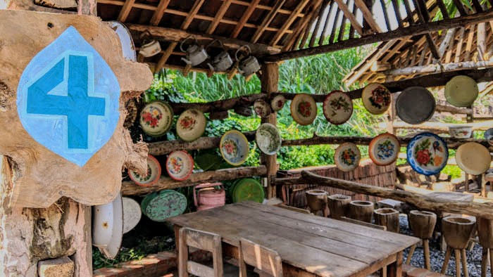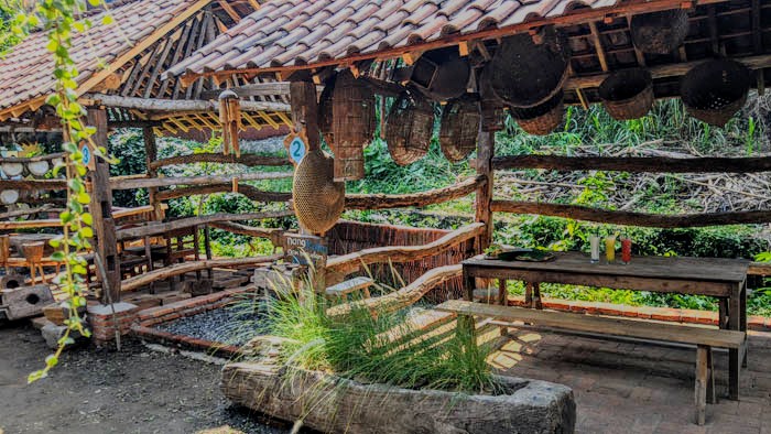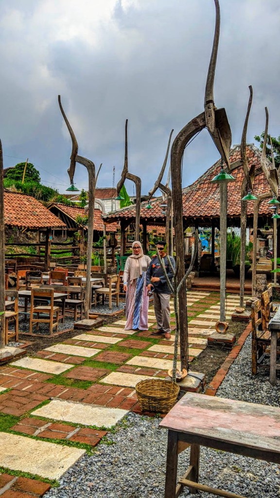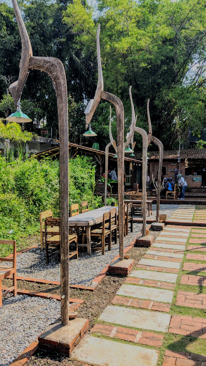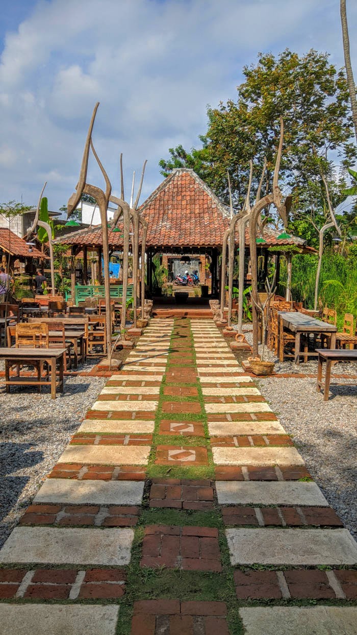 Dengan manis, kaki Anda seakan dituntun menyusuri area sepanjang kurang lebih 30 meteran mulai selasar depan, bangunan joglo, kursi-kursi, tiang lampu bekas bajakan sawah, petromax, dinding bata, tulisan-tulisan kayu, hingga pernik-pernik kecil lainnya. Beberapa blok bangunan kayu di sisi kanan joglo juga sayang untuk dilewatkan.