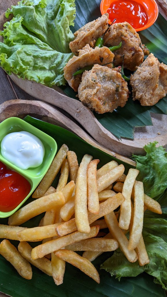 Menu ala Cafe juga tersedia cukup variatif untuk Anda yang ke sini ingin nongkrong modern. Ada french fries, tahu crispy, pisang goreng, nasi goreng, mie goreng, anek juice dll banyak banget. Harga? Standar cenderung murah. Sebanding dengan suasana dan ketenangan yang Anda dapatkan.