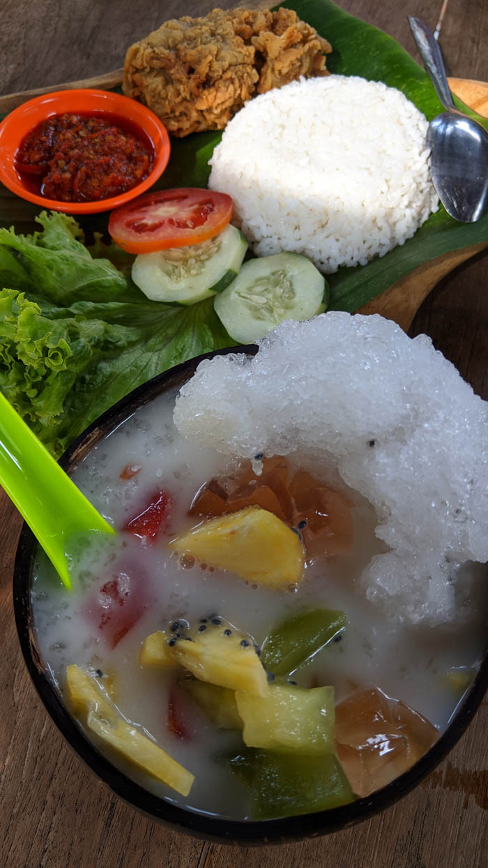 Soal menu, juga ada keunikan. Ada paket all you can eat versi tradisional berisi nasi putih, nasi jagung, tempe mendol, dadar jagung, telur dadar, renpeyek, kerupuk plus yang paling istimewa adalah sayur pedasnya. Cukup bayar 10K Anda bisa makan sampai puas.